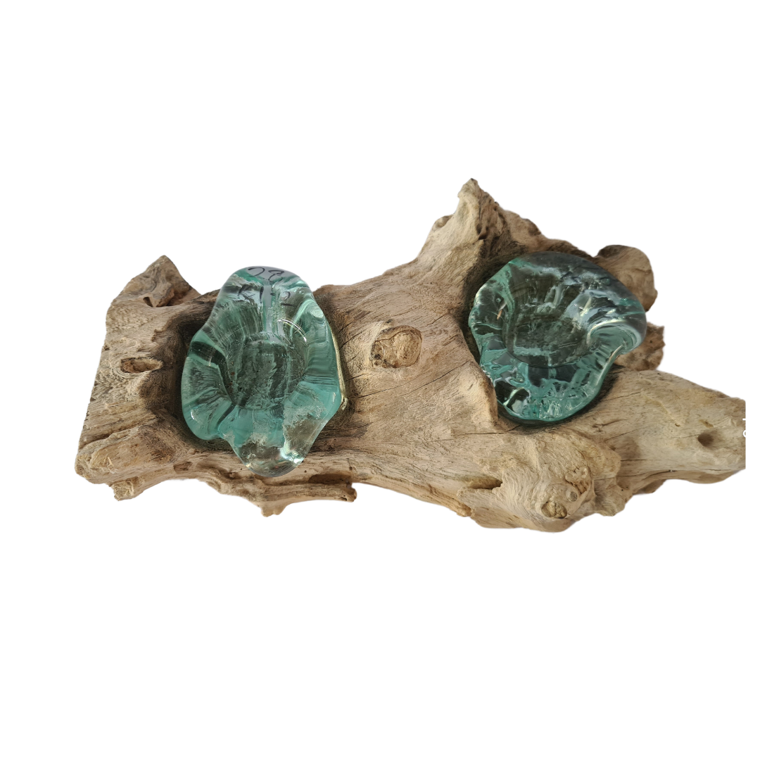 Elegant Driftwood Base: This double candle holder is elegantly mounted on a piece of driftwood, showcasing the natural textures and organic beauty of the wood. The blend of glass and driftwood not only enhances its visual appeal but also adds a touch of rustic charm to your decor.