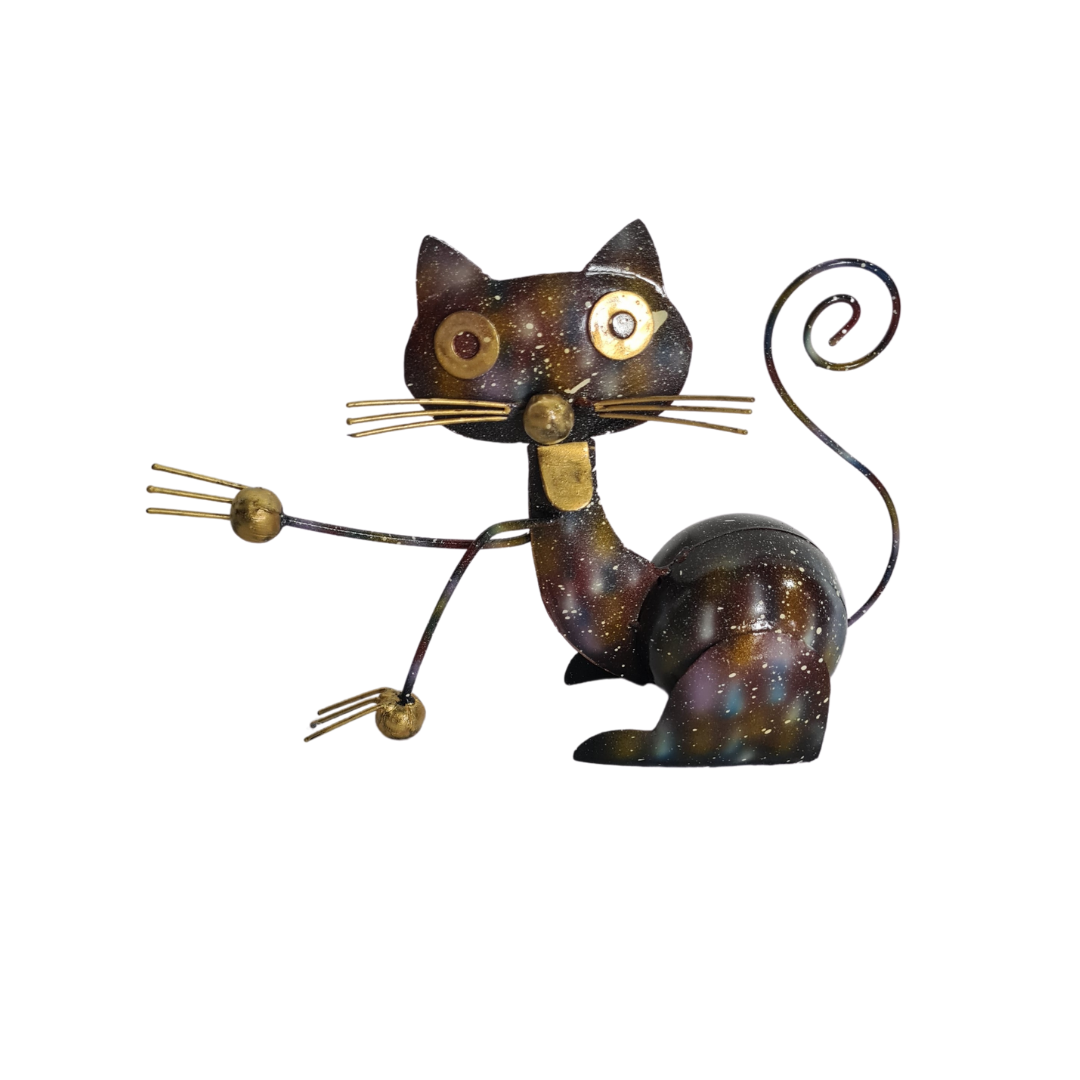 Welcome a playful touch to your décor with the Cat Figure Waving Hello. Standing at 20 cm, this handcrafted metal cat features a whimsical design with a raised paw, curly tail, and expressive whiskers, giving it a charming and friendly appearance. Perfect for shelves, desks, or entryways, this quirky cat brings personality and warmth to any space. A delightful and artistic creation from Bali Homewares, ideal for cat lovers and those who enjoy unique, handcrafted décor with a playful twist.