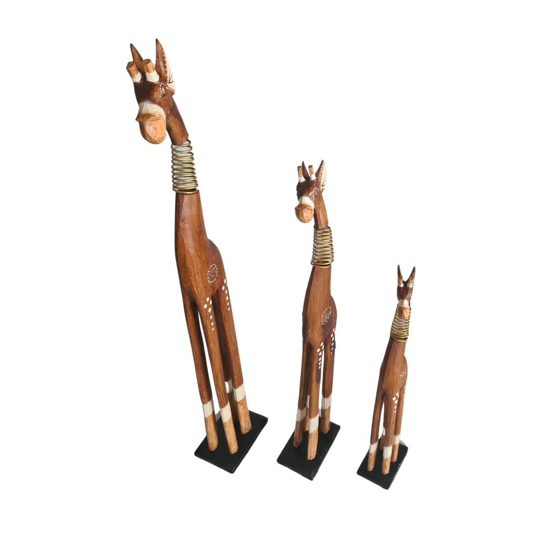 Add a touch of the wild and artistic flair to your home with our Giraffe figures with wire necks in brown colours as a set of 3 from Bali Homewares. This exquisite set features three beautifully crafted giraffe figurines, each finished in a warm brown tone with unique wire necks, standing at heights of 100 cm, 80 cm, and 100 cm. Perfect for those who appreciate unique and artistic decor, these giraffes bring a sense of elegance and adventure to any room. Whether displayed together as a cohesive ensemble or individually as striking accents, they are sure to capture attention and admiration. Experience the exceptional craftsmanship of Bali and enhance your decor with this captivating set.