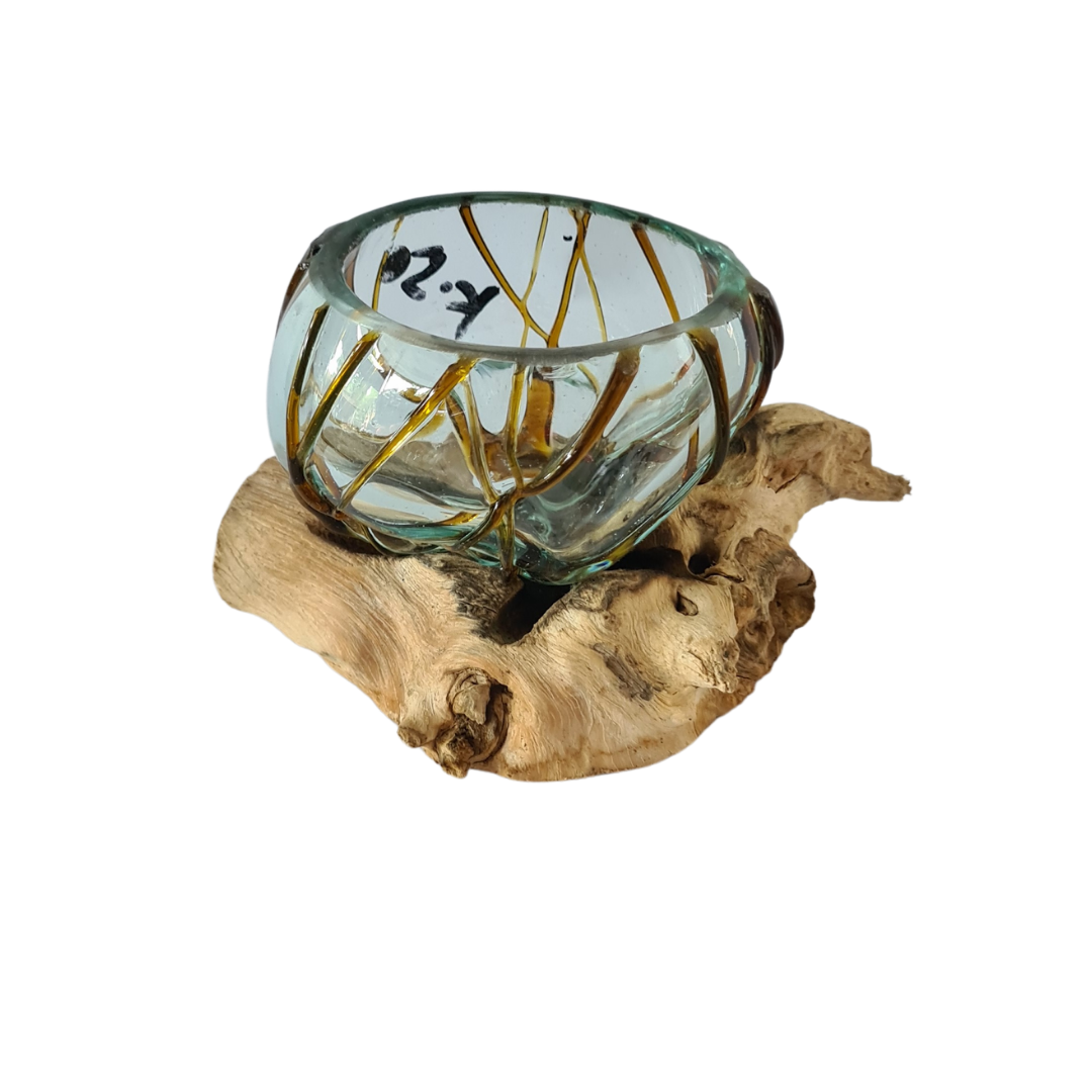 The harmonious blend of warm brown hues in the glass, elegantly set against a piece of driftwood, creates a striking visual contrast. This combination adds a sophisticated and natural element to your decor, making it an eye-catching focal point in any room.