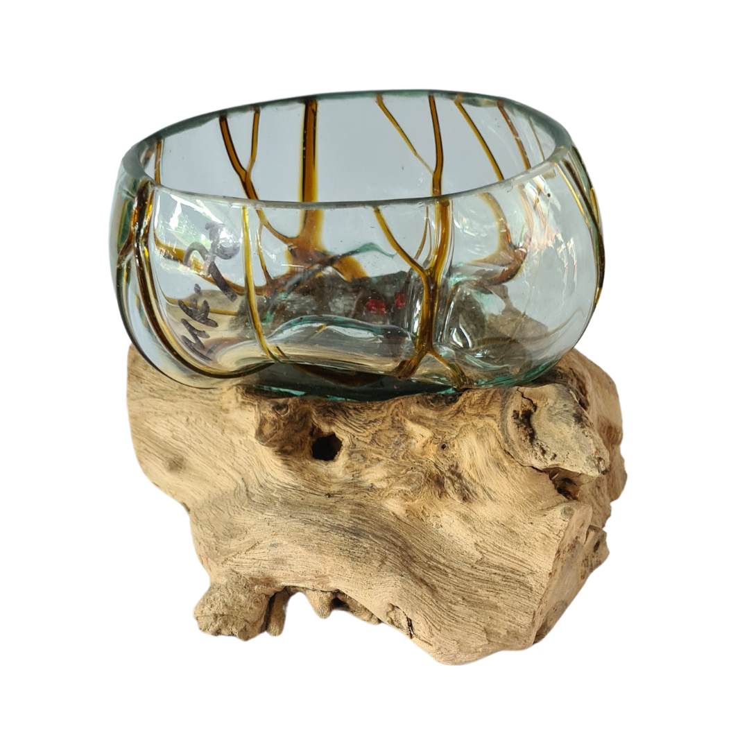 The harmonious blend of rich brown hues in the glass, beautifully integrated onto a piece of driftwood, creates a striking visual contrast. This combination adds sophistication and a natural element to your decor, making it an eye-catching focal point in any room.
