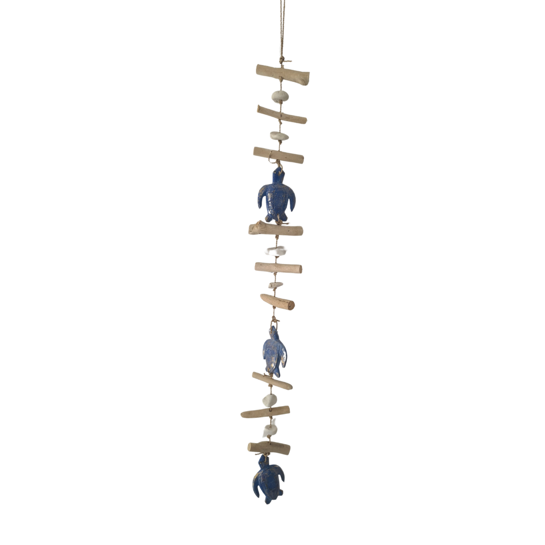 Bring the tranquil charm of the ocean into your home with the Mobile with blue turtles. This 100 cm decorative mobile features hand-carved blue turtle accents paired with natural driftwood pieces, creating a harmonious coastal-inspired design. Perfect for enhancing beach-themed interiors, kids' rooms, or outdoor patios, this mobile adds a serene and artistic touch to your space. Handcrafted by Bali artisans with attention to detail, it’s a unique decor piece that blends natural beauty with oceanic elegance. Exclusively available at Bali Homewares.