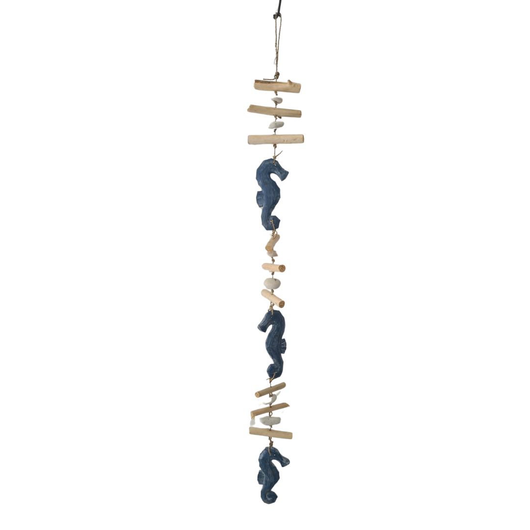 Add a touch of oceanic elegance to your decor with the Mobile with dark blue sea horses. This 100 cm handcrafted mobile features beautifully carved dark blue sea horse accents, paired with rustic driftwood elements for a coastal-inspired design. Perfect for enhancing living spaces, patios, or beach-themed rooms, this mobile brings a calming and artistic charm to your home. Crafted with care by Bali artisans, it’s a unique piece that celebrates the beauty of the sea. Exclusively available at Bali Homewares.