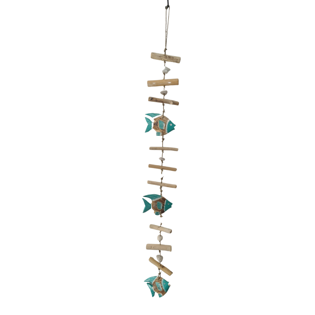 Infuse your space with the calming essence of the sea with the Mobile with green fish. This 100 cm handcrafted mobile features vibrant green fish accents paired with natural driftwood pieces, creating a rustic yet charming coastal-inspired design. Perfect for beach-themed interiors, patios, or children's rooms, this mobile brings a playful and soothing ocean vibe to your decor. Skillfully crafted by Bali artisans, it’s a unique and artistic addition to your home. Available exclusively at Bali Homewares.