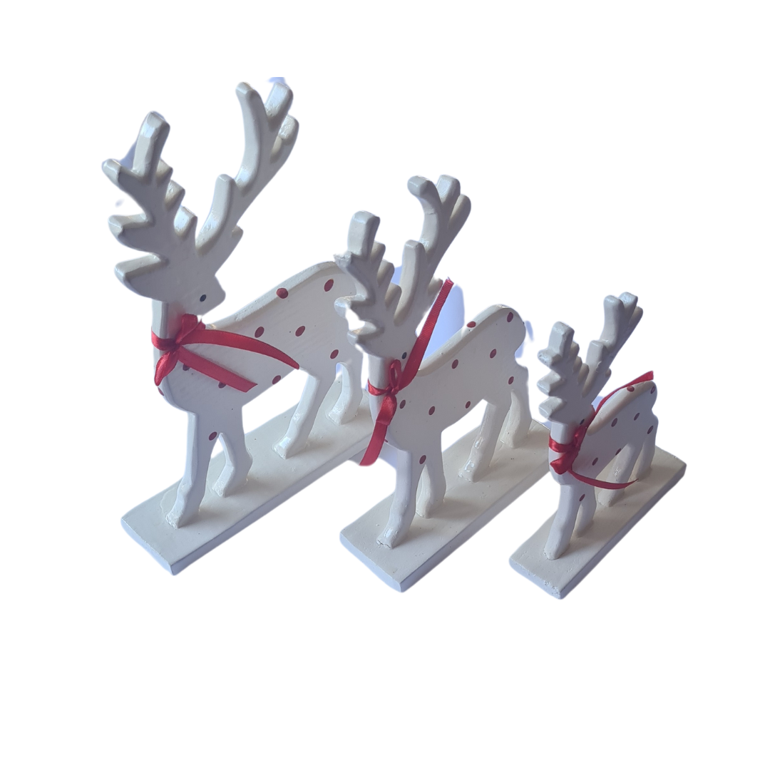 These delightful reindeer ornaments 🦌, crafted by skilled artisans and their families in Bali, offer a charming and whimsical addition to your holiday decor. Each set includes three reindeer of varying sizes, painted in a crisp white with playful red dots, symbolizing the joy and festivity of the Christmas season. The dimensions are as follows: Large (24 cm x 12 cm x 8 cm), Medium (22 cm x 10 cm x 7 cm), and Small (18 cm x 8 cm x 6 cm). This set of three provides a versatile and eye-catching display, perfect for enhancing the warmth and coziness of your home.