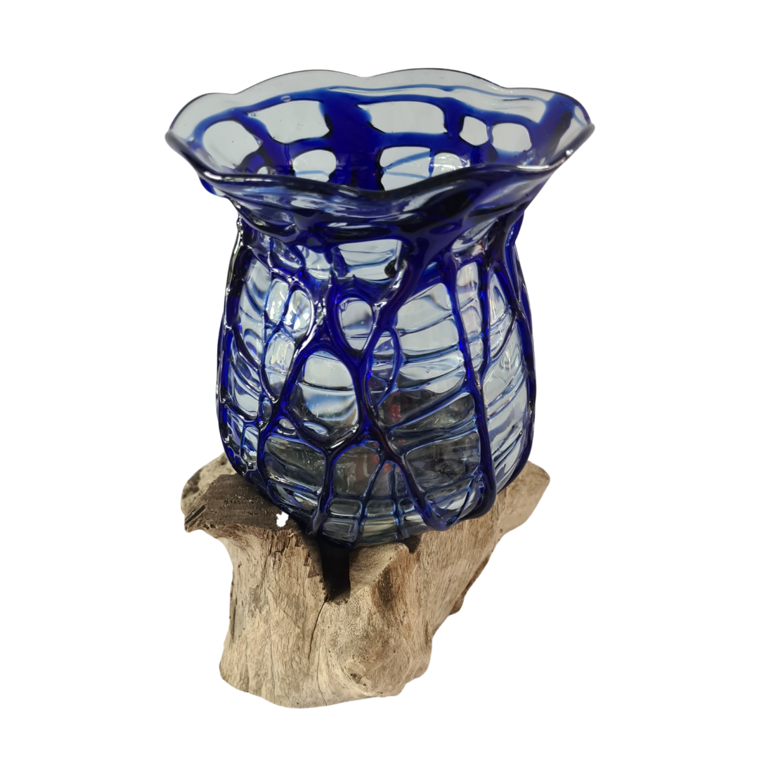 The captivating blend of vibrant blue hues in the glass, artfully set against a piece of driftwood, creates a striking visual contrast. This combination adds sophistication and a touch of nature to your decor, making it an eye-catching focal point in any room.