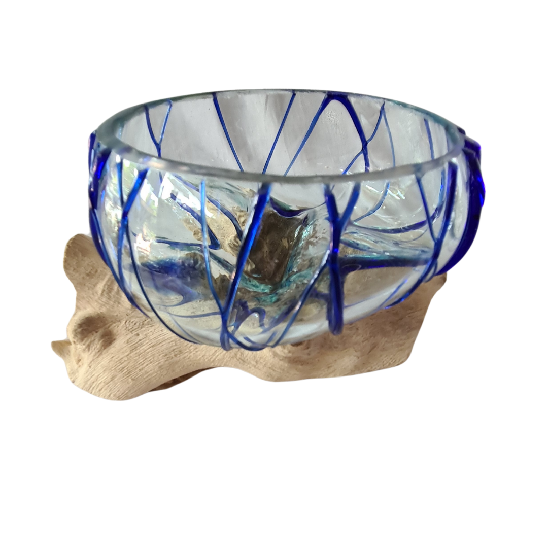 The harmonious blend of vibrant blue hues in the glass, elegantly forged onto a piece of driftwood, creates a striking visual contrast. This combination adds an organic and sophisticated touch to your decor, making it a focal point in any room.