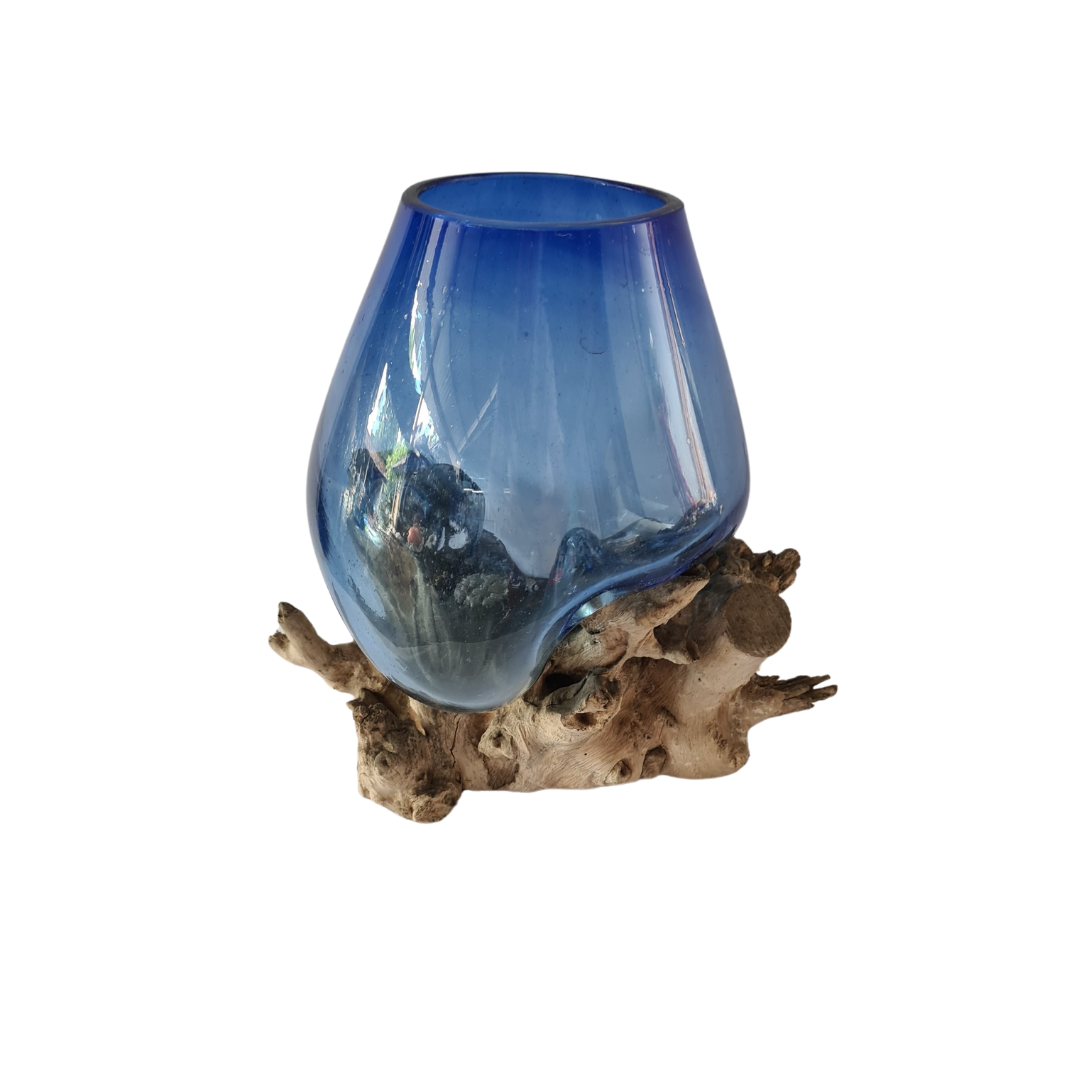 The eye-catching blue hues of the glass are elegantly integrated onto a piece of driftwood, creating a stunning visual contrast. This combination adds sophistication and a touch of nature to your decor, making it an enchanting focal point in any room.