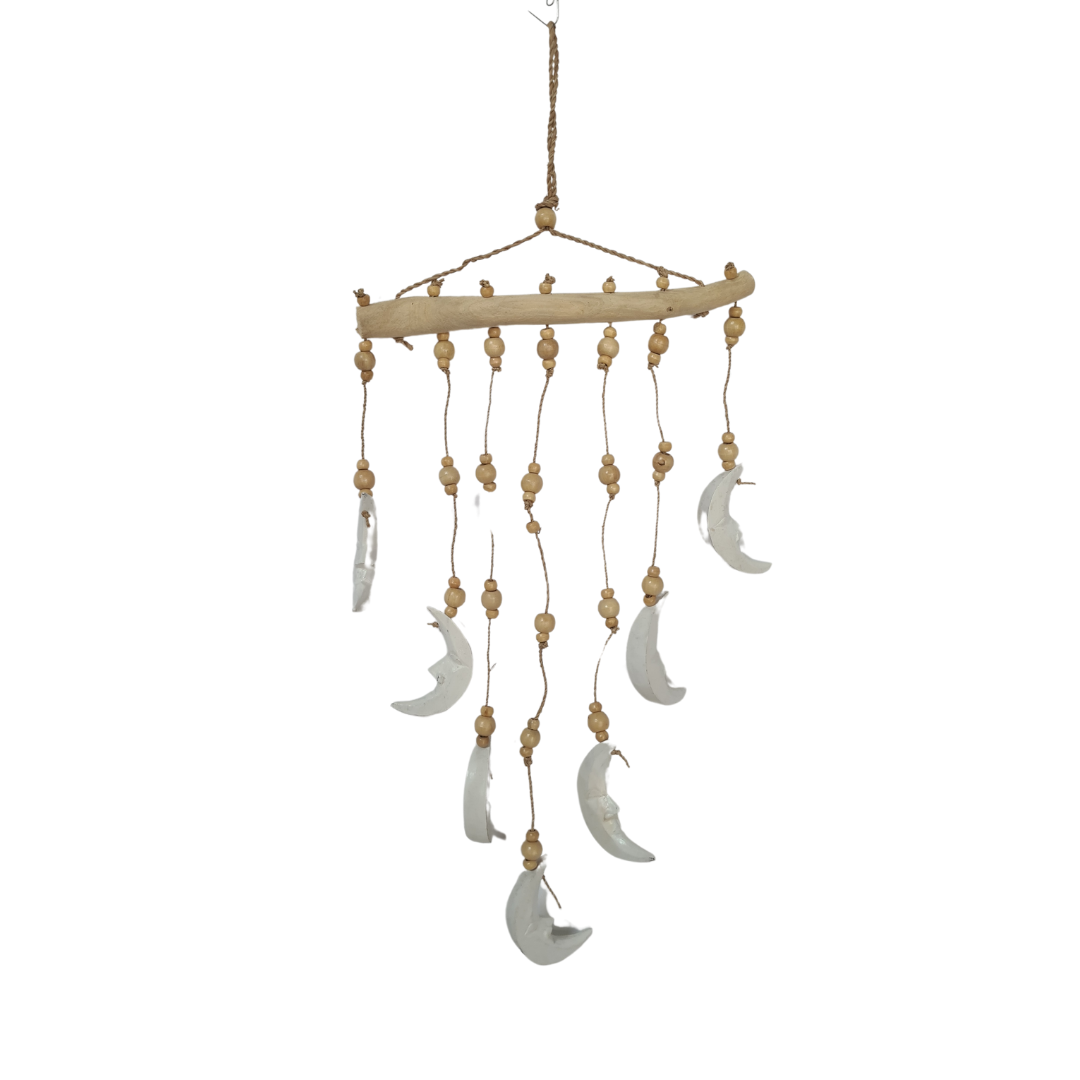 Bring a touch of celestial charm to your space with the wooden wall decoration with white half moons. This 50 cm handcrafted piece features elegant white half-moon shapes hanging from a natural wooden rod, enhanced with decorative wooden beads. Perfect for adding a serene and dreamy vibe to bedrooms, nurseries, or bohemian-inspired interiors, this wall decor beautifully reflects the artistry of Bali craftsmanship. A timeless and versatile addition to your home, exclusively available at Bali Homewares.